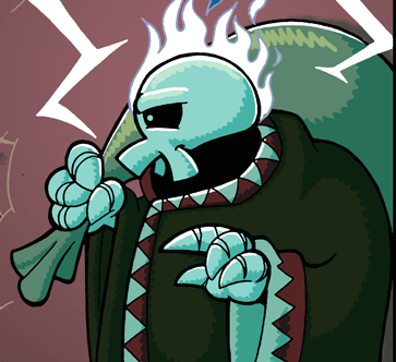 Es un hombre esquelético con túnica café de encajes rojos quien carga con un saco sin fondo a dondequiera que vaya.