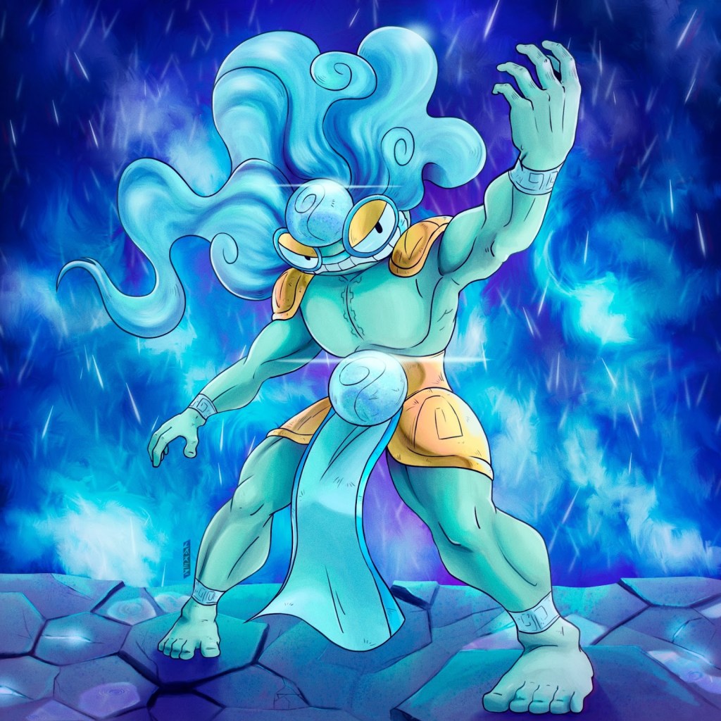 En Macóatl es un ser titánico de piel azul con una llave de agua como nariz.