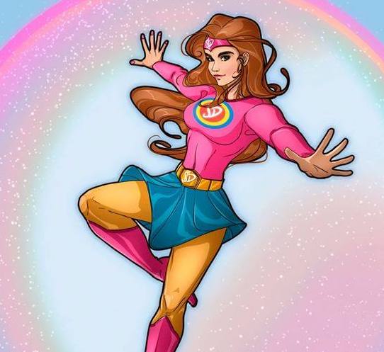 Es una mujer de cabello castaño con traje rosado, escudo con su emblema al pecho, tiara rosa y pantalones igualmente rosados.