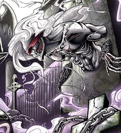 Es un hombre de piel gris con cabello blanco alargado y los ojos rojos vendados con una bandana roja. Lleva una armadura de hueso.
