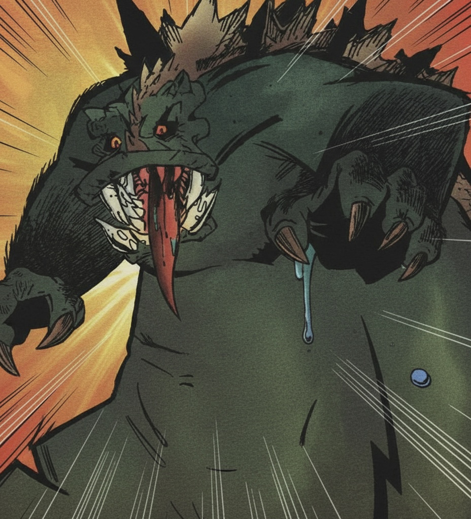 Tiene la apariencia de un híbrido mitad Godzilla mitad ornitorrinco, con púas en la espalda y toda la cosa.