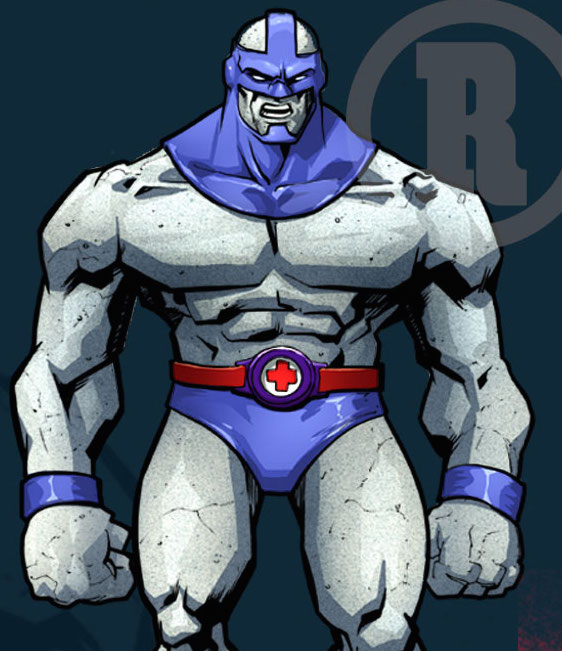 Es un hombre muy grande de piel de concreto quien viste guantes azules, calzoncillos azul con cruz roja y una máscara de cruz azul.