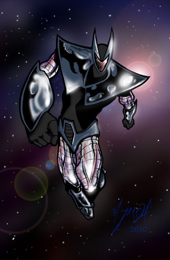 Es un androide con una armadura gris plateada, brazos extensibles, antenas, planeadores y una pantalla roja con forma de V.