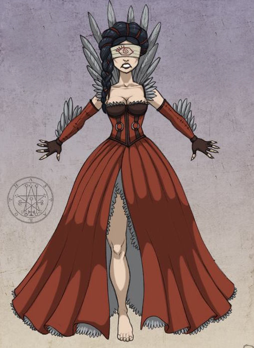 Porta un vestido colonial rojo, con encajes blancos. Está peinada con una trenza en su cabello negro y tiene sus ojos cubiertos con una venda ciclópea con un espiral a la mitad.