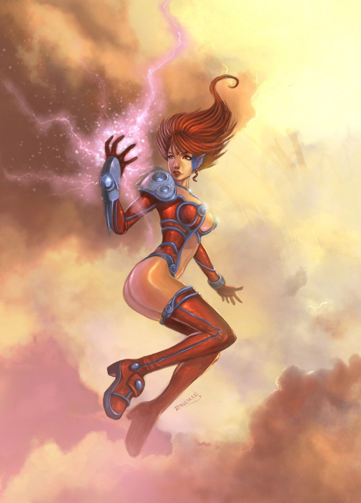 Su vestimenta heroica consta de un par de botas de color rojo y una armadura también de color rojo que sólo le cubre los brazos y parte de la espalda y el pecho. Su cabello y ojos se vuelven rojos de un color destellante similar al de Meteorix.