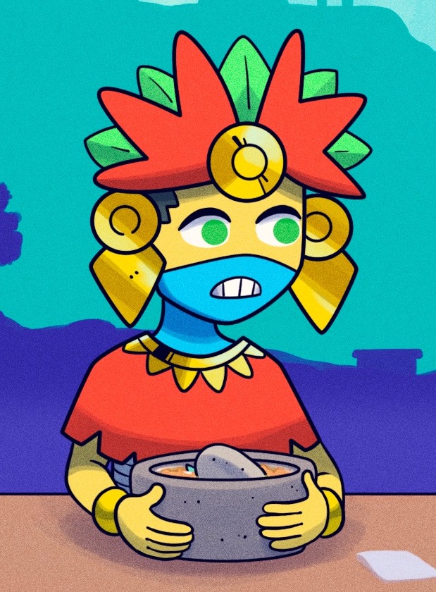 Es un hombre de piel azul con penacho, máscara y aretes dorados.