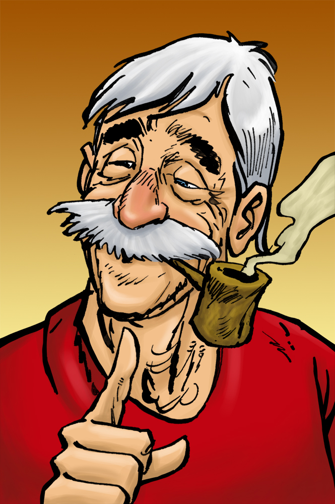 Es un hombre anciano, canoso, con bigote y ojo azul.