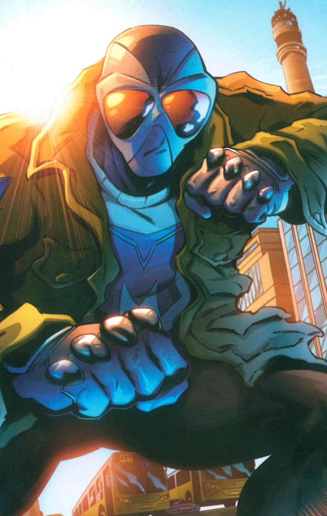 Viste un traje azul con máscara, googles amarillos y una chaqueta verde.