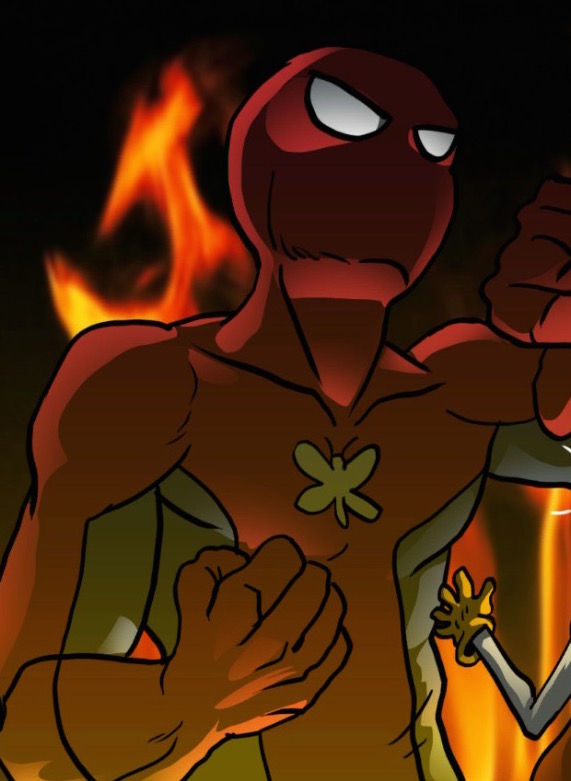 Es un hombre de vestimenta roja con máscara roja y un emblema de insecto al pecho.