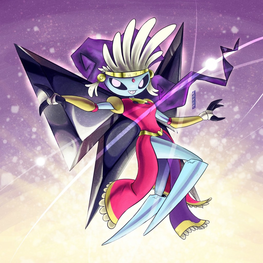 Fue designada también como diosa de la guerra y los sacrificios. Portaba un manto que la hacía invisible y asesinaba a sus enemigos con sus poderosas cuchillas ocultas en sus alas de mariposa.