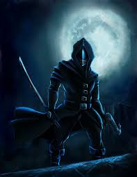 Originalmente en su primer diseño (y así aparece en la portada de la novela) es un hombre con un traje negro encapuchado estilo ninja o asesino.