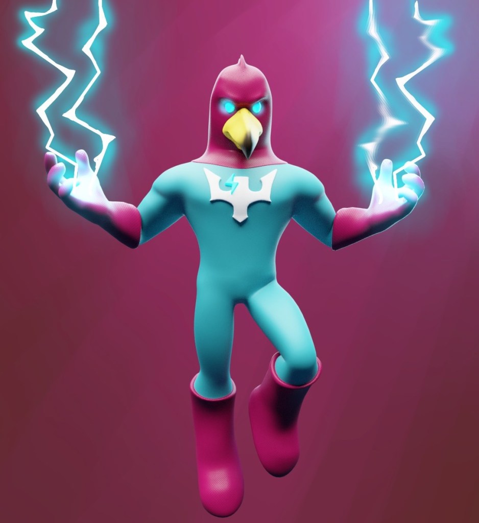 Es un ave con un traje verde aqua, con guantes, botas y capucha violeta.