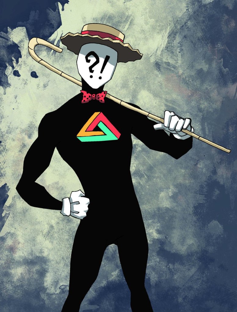 Es un hombre que viste de un traje plegado negro, moño, máscara blanca con signos de interrogación y admiración. Lleva sombrero, guantes blancos y porta un bastón de caña. Además carga en el pecho el símbolo del Triángulo de Penrose.
