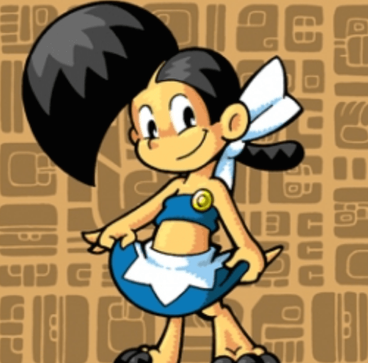 Es una mujer calva con un cuerno negro que parece cabello. Es una chica chaparra con piernas de dinosaurio que suele vestir falda y atuendo azteca.