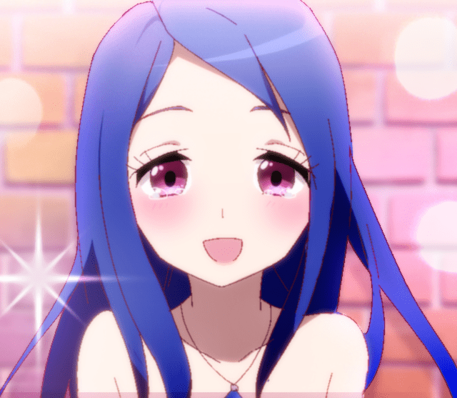 Es una muchacha de cabello azul y vestido de falda rosa.