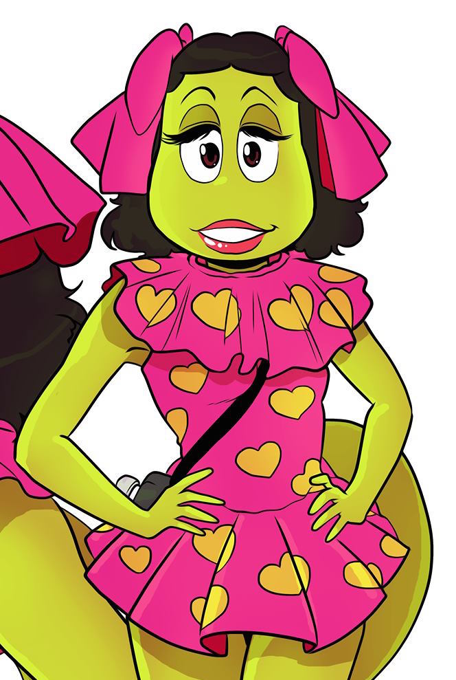Es una sensual lagartija humanoide de cabello negro, vestido rosa y grandes moños.
