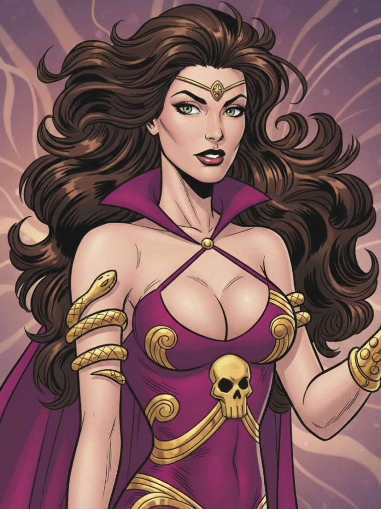Es una exótica y sensual mujer de traje dorado, cabello negro, emblema de calavera al pecho y que suele estar acompañada de una serpiente que rodea su cuerpo. Viste también tacones.