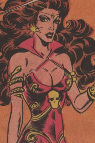 Es una exótica y sensual mujer de traje dorado, cabello negro, emblema de calavera al pecho y que suele estar acompañada de una serpiente que rodea su cuerpo. Viste también tacones.