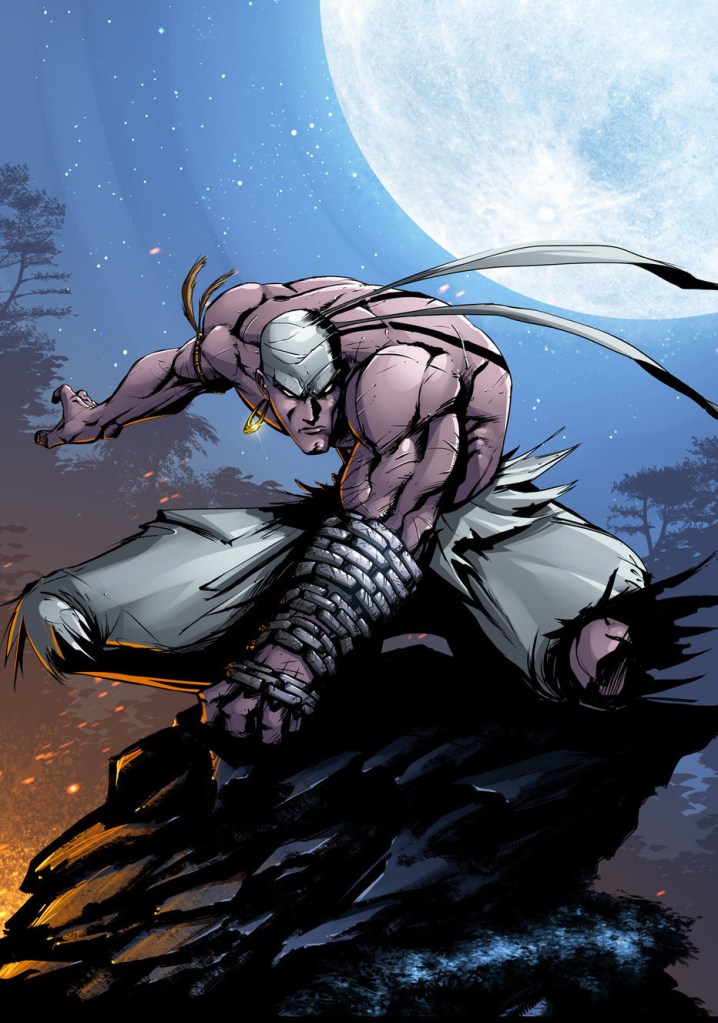 Es un hombre fornido con una bandana blanca en la cabeza, pantalón blanco, cadenas en sus muñecas y un pendiente dorado en su oreja.