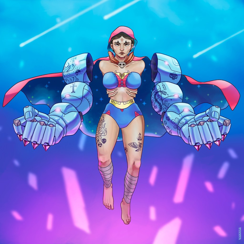 Es una mujer morena con brazos de piedra y túnica rojiza.