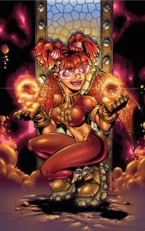 Es una mujer de cabello pelirrojo con lentes, top rojo, pantalones rojos, botas y alas de murciélago también rojas.