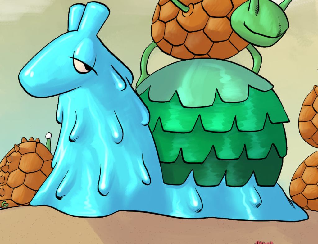 Es un caracol azul con caparazón de tortuga.