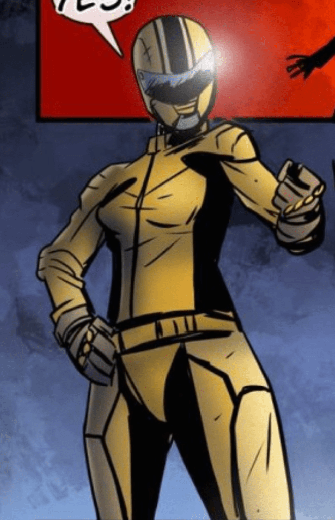 Es una mujer de rasgos chinos quien viste un traje de motociclista amarillo con un casco amarillo.