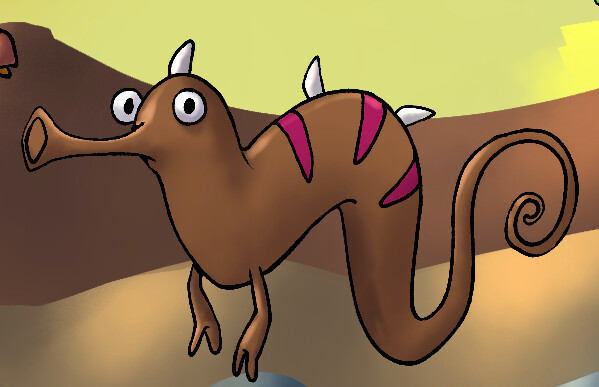 Su apariencia está basada en un caballo de mar sanguijuela café con espinas en la espalda y boca de trompeta.