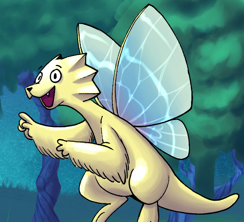 Es un canguro amarillo con cabeza de perro y alas de mariposa.