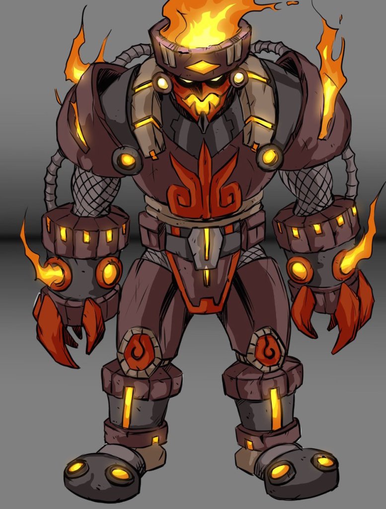 Tiene la apariencia de un golem de piedra roja en llamas con un bracero en al cabeza.