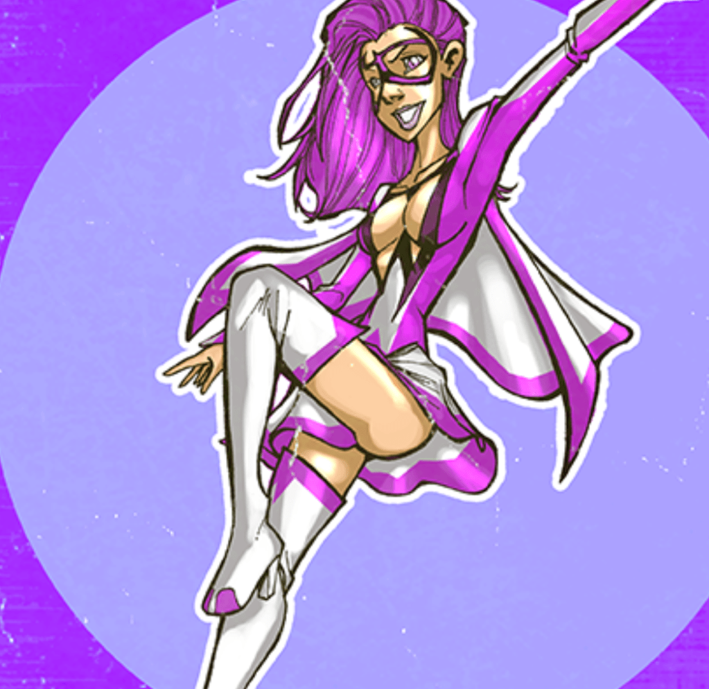 Viste su sensual traje de heroína que se conforma de botas blancas y moradas, mini falda blanca y violeta, capa blanca y morada, antifaz morado, y una camisa igualmente blanca y morada con un escote exagerado.