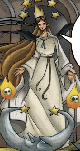 Es una mujer de cabello rubio, túnica blanca, con una corona, alas de murciélago, en un trono con una luna estrellada. Un conjunto de serpientes la acompañan en los costados.