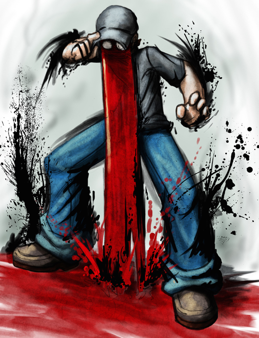 Es un joven que usa jeans, camisa y gorro. Es característico que tiene sangre brotando como cascada frente a su cara.
