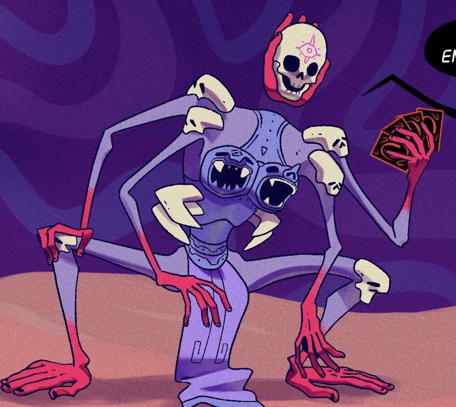Es una mujer monstruosa, esquelética y gigante de cuatro brazos y cabeza de cráneo.