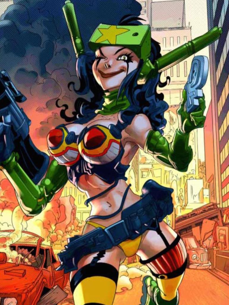 Porta un brazier negro con copas amarillas sonrientes y de cara de payaso. Una tiara verde con una estrella en el tercio derecho, guantes verdes, calzoncillo dorado, cinturón negro, una bota verde y la otra dorada, todo cargado con munición y armas.