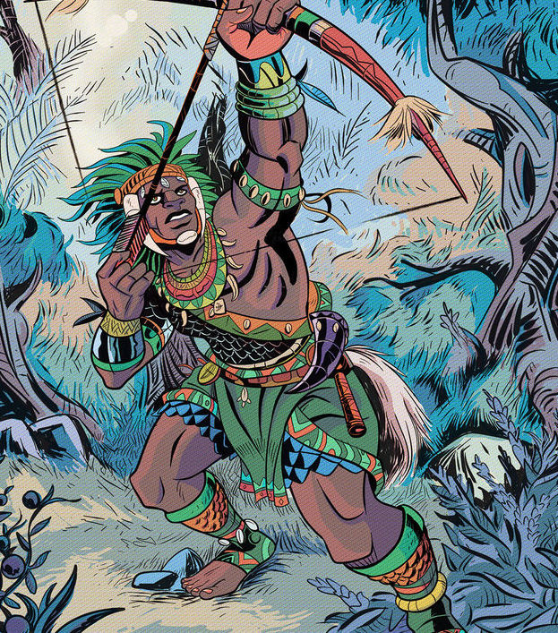 Es un hombre moreno de vestimenta verde quien carga un arco y flecha.