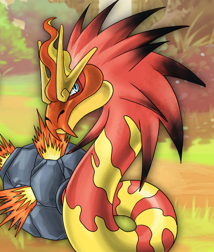 Empezamos el conteo con un PokeMx, la evolución final de Serpibel. Inspirado en el Xiuhcóatl de la mitología mexica, Basilumbre es una poderosa criatura con ataques que incluyen escupir fuego y golpes de cola.