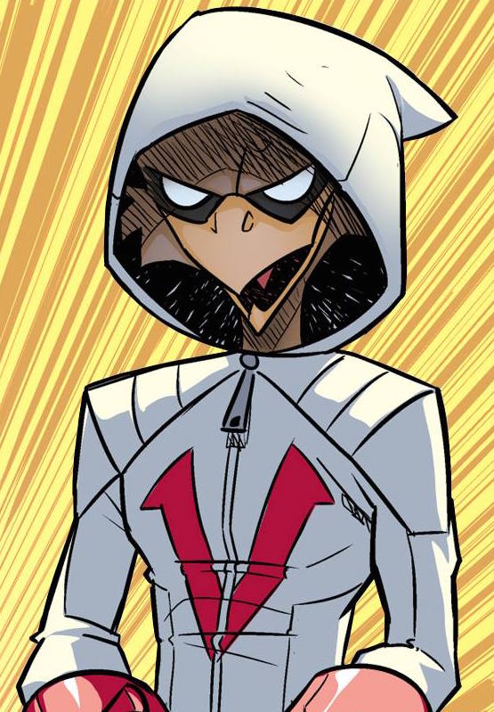 Porta un traje blanco con antifaz, chaqueta, guantes, cinturón y botas rojas o azules. Su emblema es una V que lleva al torso.