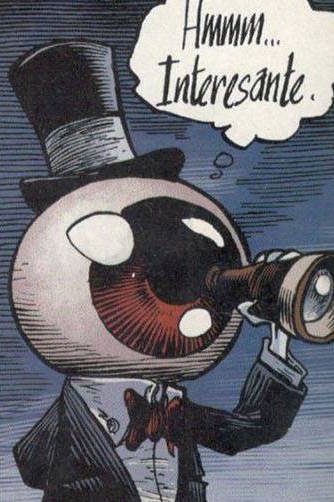 Es un hombre en traje con camisa, moño y sombrero de copa, quien tiene un ojo gigante por cabeza.