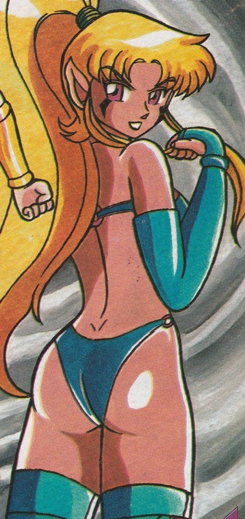 En su forma humana es una chica de botas, guantes y bikini azul aqua, cabello rubio en cola de caballo, ojos rojos y orejas puntiagudas.