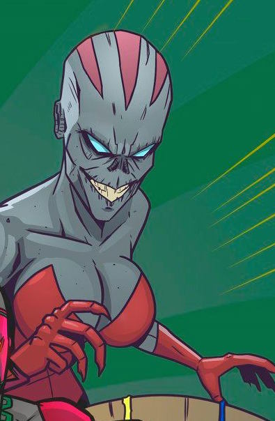 Es una mujer cadavérica de piel gris con un vestuario rojo de encajes negros. Sus ojos son azules, es calva y tiene marcas rojas en la cabeza.