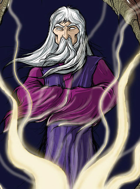 Es un anciano de cabello blanco y alargado con barba blanca y ojos blancos vistiendo túnica morada.