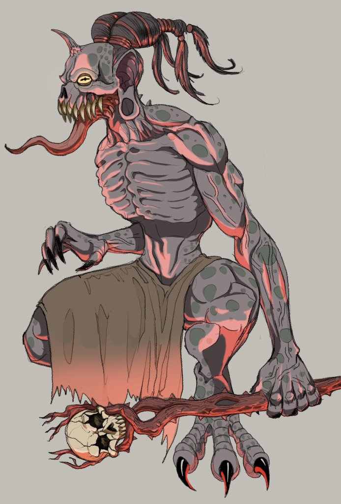 Era descrito como un hombre alto, viejo y jorobado, sin mandíbula inferior, con lengua larga, patas de águila y quien se desplazaba con apoyo de un bastón.