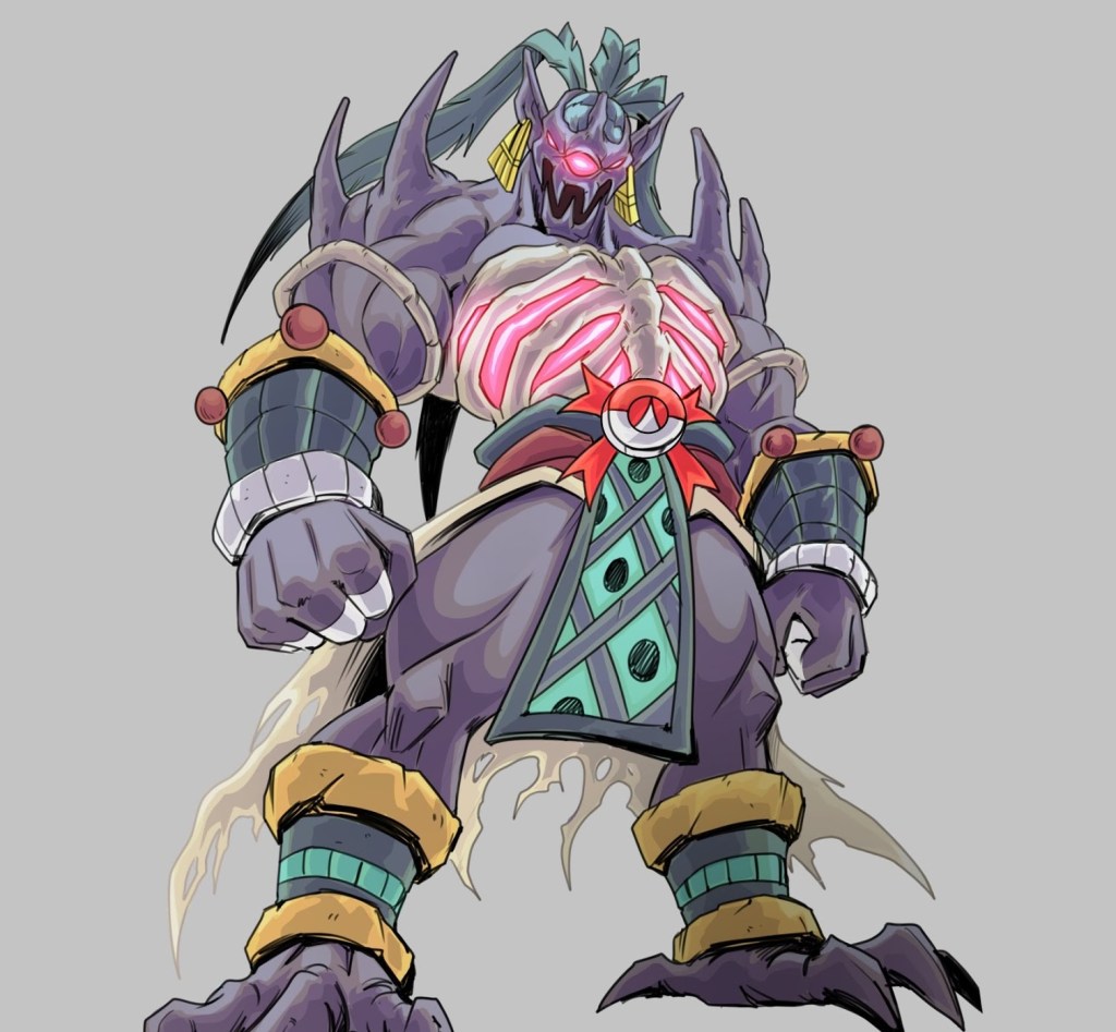 En su forma verdadera, como monstruo, es una inmensa serpiente gris de tres ojos rojos. También puede fusionar su forma humana con su forma de monstruo para crear a un guerrero humanoide monstruoso de tres ojos.