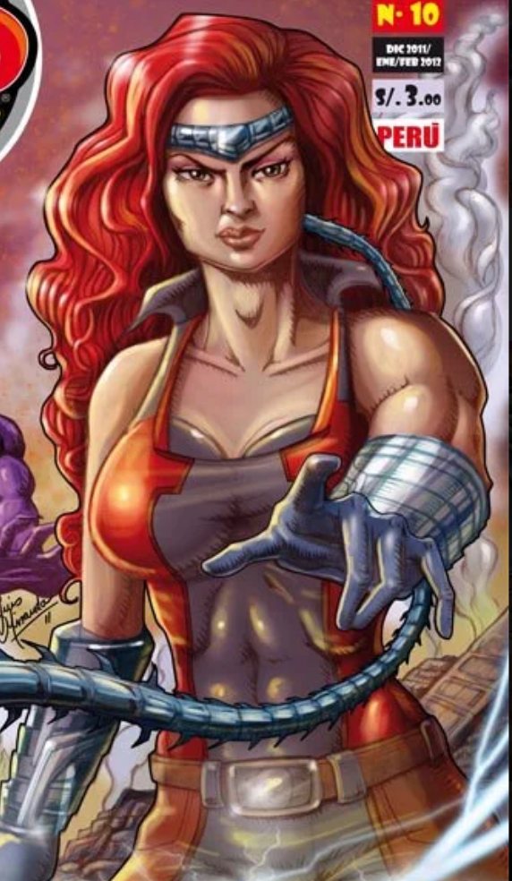 Es una mujer pelirroja que se caracteriza por llevar una cola extensible metálica de escorpión al cuello.