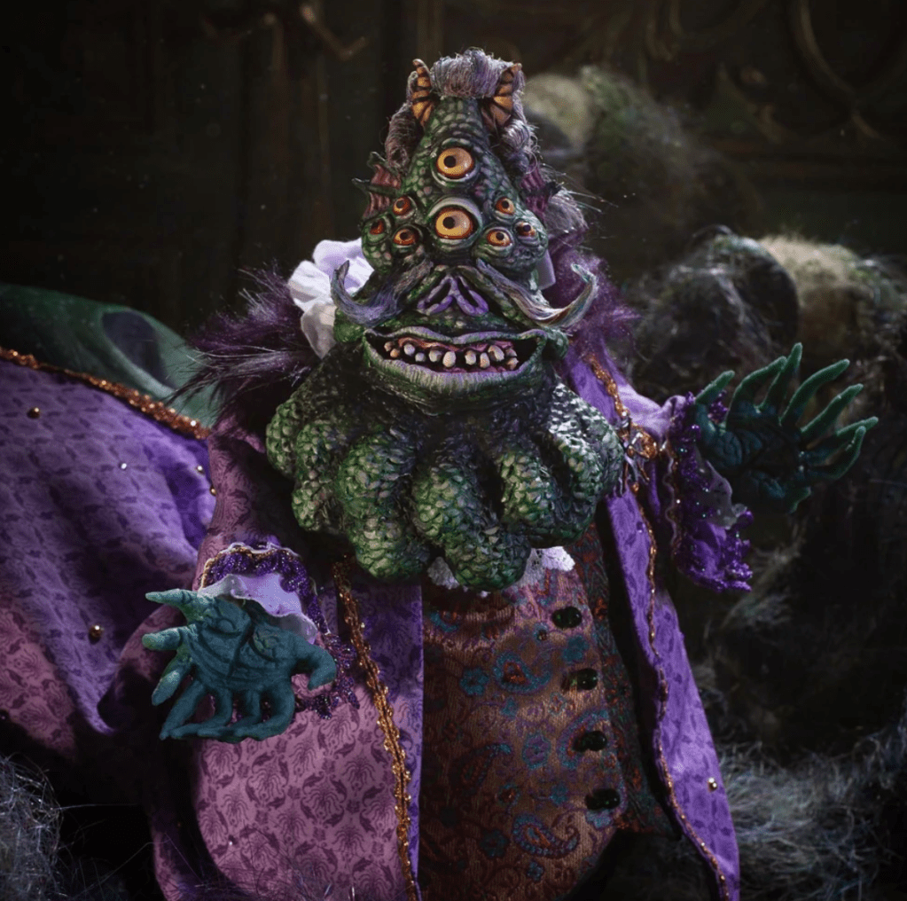 Es un centauro-araña de ocho patas, piel verde, ocho ojos, ocho dedos en cada mano, traje morado y peluca antigua.
