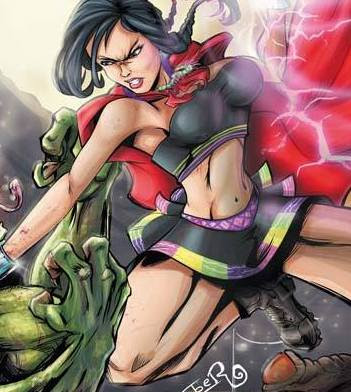 Es una mujer de cabello negro quien viste top y falda negra, con capa roja.
