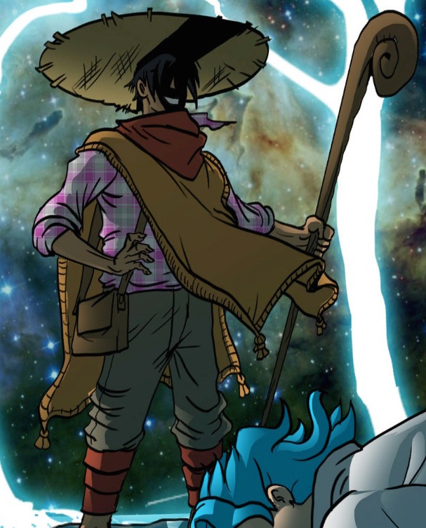 Viste un jorongo y un enorme sombrero de campo que siempre hace imposible ver su rostro. Carga consigo además un cayado que le sirve para canalizar sus poderes.