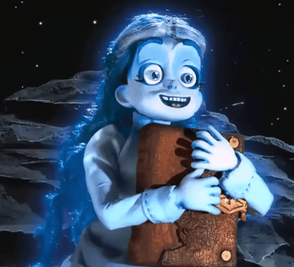 Apareció por primera vez en Soy Frankelda del 2025. Fue diseñada por la lingüista Gina H. Amelio de una fusión de latín, griego, sánscrito, catalán y náhuatl.