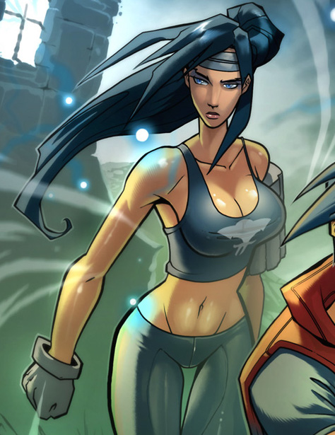 Es una mujer de cabello negro que suele vestir un sostén deportivo negro con el emblema de los Soulkeepers y un pantalón plegado negro. A veces lleva también consigo una bata.